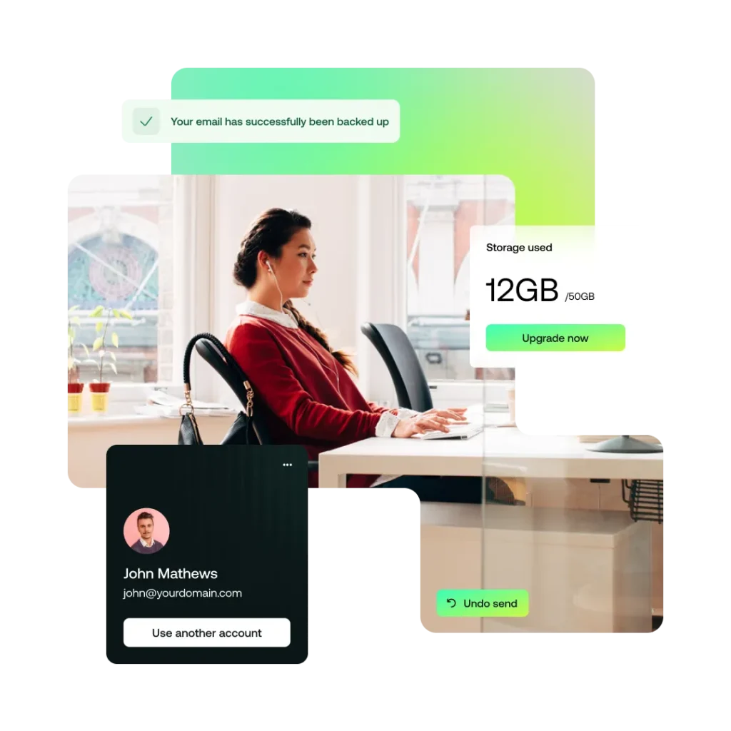 E-mails personalizados criam confiança, aumentam a credibilidade e mantêm suas comunicações limpas e consistentes. Seja você um freelancer, uma startup ou um profissional autônomo, nossos planos de e-mail profissional oferecem tudo o que você precisa para começar: ferramentas de calendário e contato, segurança integrada e uma interface limpa e funcional. Sem excessos, sem extras confusos – apenas um e-mail sólido para realizar suas tarefas.